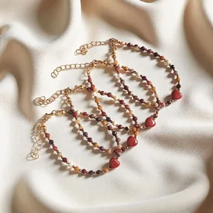 cena dot. 1 bransoletki (wysyłane losowo) Urocza, bardzo delikatna, ale efektowna bransoletka pełna miłości! na solidnej lince stalowej (miękkiej) - została wykonana z serduszka z jaspisu króle ...