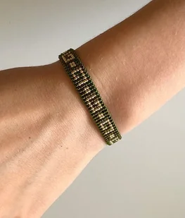 Bransoletka w piękny wzór, w kolorze złota i zieleni, tkana na krośnie ze szklanych, odpornych na ścieranie koralików toho. Delikatna, kobieca, pasuje na każdy nadgarstek. Szyta wytrzymałymi nylonow ...
