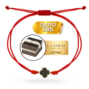 Idealne na prezent, Ściereczka do czyszczenia złota, aby Twoja biżuteria zawsze olśniewała, Naklejka informująca, jaka próba złota została wykorzystana do produkcji bransoletki. Zgodnie z obowiązującymi w Polsce przepisami, wyroby ze złota o wadze powyżej 1g oznaczone są odpowiednią cechą probierczą nadaną przez Okręgowy Urząd Probierczy, co potwierdza i gwarantuje autentyczność złota. Zanurz się w blasku wyjątkowej złotej bransoletki z czarną koniczynką, której tajemniczy onyks hipnotyzuje głębią barwy. Ten symbol szczęścia spleciony z lekkim czerwonym sznurkiem otula nadgarstek, dodając każdej chwili niepowtarzalnej magii. Precyzja wykonania i szlachetne złoto 585 z najwyższą starannością oprawiło kunsztownie półszlachetny kamień onyks, podkreślając jego ponadczasowy luksus i subtelną tajemniczość.