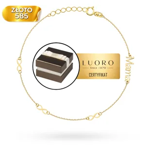 W zestawie znajdziesz: Złota bransoletka Luoro, Próba 585, Eleganckie ozdobne pudełko jubilerskie z satynową kokardką i welurową wkładką, Certyfikat Wyrobu Jubilerskiego w formie plastikowej karty - potwierdzający autentyczność wyrobu jubilerskiego, Oryginalna metka jubilerska, na której nie ma ceny. Idealne na prezent, Ściereczka do czyszczenia złota, aby Twoja biżuteria zawsze olśniewała, Naklejka informująca, jaka próba złota została wykorzystana do produkcji bransoletki. Zgodnie z obowiązującymi w Polsce przepisami, wyroby ze złota o wadze powyżej 1g oznaczone są odpowiednią cechą probierczą nadaną przez Okręgowy Urząd Probierczy, co potwierdza i gwarantuje autentyczność złota. Odkryj magiczny symbol nieskończonej miłości zaklęty w tej złotej bransoletce, stworzonej by celebrować jej wyjątkowość – Mamy.