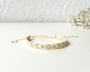 Bransoletka w złoto kremowym odcieniu, tkana na krośnie ze szklanych, odpornych na ścieranie koralików toho. Delikatna, kobieca, pasuje na każdy nadgarstek. Szyta wytrzymałymi nylonowymi nićmi, z zapięc ...
