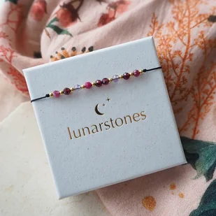 Bransoletka z kamieniami naturalnymi o szczególnych właściwościach dla zodiakalnego Barana. Użyte minerały: - rubin - granat - ametyst - turmalin Kamienie nawleczone na mocny nylonowy sznurek, przep ...