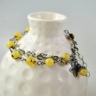 Bransoletka wykonana w całości ze srebra (próba 925) z bursztynem i perłami. Całość została zoksydowana (przyciemniona) i wypolerowana. Długość regulowana 20 - 23 cm. Biżuteria zostanie ozdobnie zapakowana. ...
