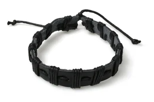 skóra naturalna, sznurek jubilerski woskowany Szerokość: 1,4 cm Średnica: ok. 8 cm, regulowana Typ rzemyka: czarny skórzany Typ zapięcia: węzeł Waga: