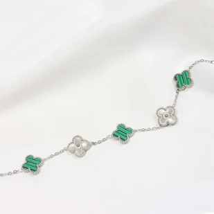 Damska bransoletka srebrna koniczynki zielone w paski i srebrne z kropkami stal jubilerska
