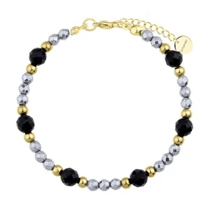 Bransoletka wykonana z fasetowanych, srebrnych hematytów oraz czarnych turmalinów, wykończona złoconymi elementami ze stali szlachetnej. Niezależnie od tego, czy planujesz specjalny wieczór, czy szukasz wyjątkowego dodatku do codziennego stroju, bransoletka z naturalnymi hematytami i turmalinami jest doskonałym wyborem. Dodaj blasku swojemu wyglądowi i poczuj luksus dotyku szlachetnych kamieni każdego dnia. Znakomity dodatek do codziennego ubioru dla kobiet lubiących oryginalną biżuterię. Noś ją samą lub stwórz własną kompozycję z innymi bransoletkami.