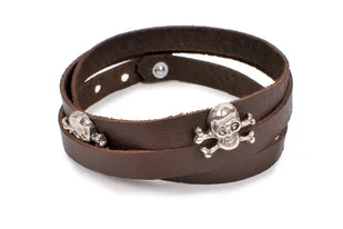 Skórzana bransoletka potrójna z czaszkami Oryginalna brązowa skórzana bransoletka w postaci rzemienia z dwoma czaszkami. Zakładana poprzez trzykrotne obwinięcie nadgarstka. Posiada wygodne zapięcie na jedną z trzech dziurek. ✔ Produkt jest dostępny ✔ Polska marka ✔ Fabryczne opakowanie Informacje Marka: Jubileo Kraj produkcji: