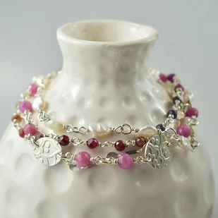 Bransoletka wykonana w całości ze srebra (próba 925) z rubinem, perłami i szafirem. Długość regulowana 20,5 - 24,5 cm. Biżuteria zostanie ozdobnie zapakow ...