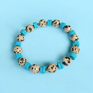 Kolorowa i niepoważna bransoletka na solidnej lince elastycznej, wykonana z fasetowanego jaspisu dalmatyńskiego (ok. 9mm) oraz turkusowej, porowatej lawy i przekładek ze złotego hematytu. obw. wew ...