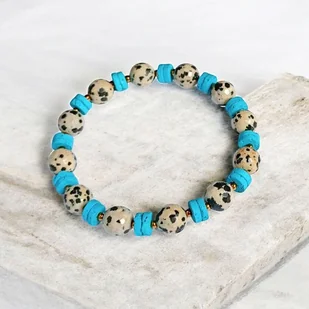 Kolorowa i niepoważna bransoletka na solidnej lince elastycznej, wykonana z fasetowanego jaspisu dalmatyńskiego (ok. 9mm) oraz turkusowej, porowatej lawy i przekładek ze złotego hematytu. obw. wew ...