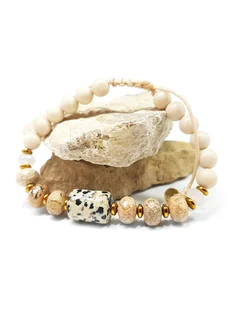 Bransoletka wykonana z jaspisu dalmatyńczyka, jaspisu pejzażowego, kwarcu różowego, kamienia rzecznego i hematytu oraz mocnego sznureczka. Bransoletka będzie odpowiednia na nadgarstek o obwodzie 14,5 ...