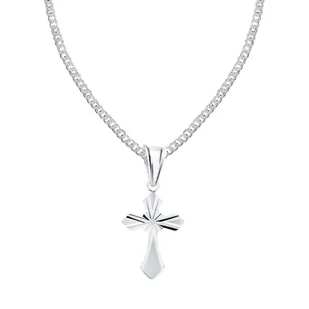 W połączeniu z ozdobnym krzyżykiem tworzy wspaniały dodatek oraz pamiątkę. Zawieszka w tym modelu została wzbogacona o niezwykłe frezy znajdujące się na awersie, które pod wpływem światła dają wspaniałe refleksy. Ramiona oraz podstawa krzyżyka zostały oszlifowane w kształt szpica, ale nie posiadają żadnych ostrych krawędzi, dzięki temu biżuteria jest całkowicie bezpieczna dla skóry. Srebrny łańcuszek z krzyżykiem został w całości wypolerowany na wysoki połysk. Biżuteria została poddana rodowaniu, dzięki czemu nie zaśniedzieje tak szybko jak klasyczne białe srebro.
