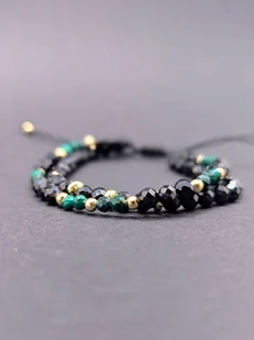 Opis: Delikatna, ręcznie robiona bransoletka na czarnym, regulowanym sznurku z fasetowanego czarnego turmalinu, głębokozielonego malachitu, złotego hematytu i złocistych kulek ze stali szlachetnej. Połączenie czerni, szlachetnej zieleni i złotych akcentów tworzy elegancką, minimalistyczną kompozycję, która kojarzy się z nocnym lasem rozświetlonym blaskiem księżyca. To subtelny talizman ochrony, równowagi i odwagi – dla osób, które lubią prostą, ale charakterystyczną biżuterię, pasującą zarówno do codziennych stylizacji, jak i wieczornych wyjść. Ze względu na naturalne pochodzenie kamieni każda bransoletka może nieznacznie różnić się od tej przedstawionej na zdjęciach – właśnie dzięki temu każdy egzemplarz jest jedyny w swoim rodzaju. Kamienie i materiały: