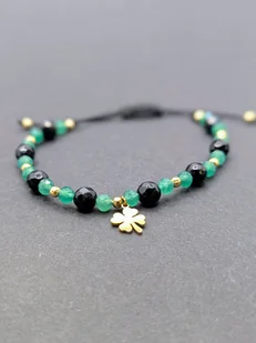 Minimalistyczna, ręcznie robiona bransoletka na czarnym, regulowanym sznurku. Połączenie fasetowanego awenturynu w świeżym, zielonym odcieniu z głęboką czernią onyksu tworzy prostą, elegancką kompozycję. Całość dopełniają złote przekładki ze stali szlachetnej pozłacanej oraz zawieszka w kształcie koniczynki — subtelny symbol szczęścia, który pięknie „robi” cały look. W symbolice kamieni ten zestaw jest często wybierany jako amulet szczęścia i dobrobytu. Awenturyn kojarzy się z przyciąganiem sprzyjających okoliczności, rozwojem i „zielonym światłem” dla nowych możliwości, a onyks wnosi stabilizację i spokój — pomaga trzymać się planu i chronić energię przed chaosem dnia codziennego.