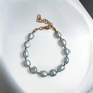 Zjawiskowa bransoletka wykonana z pięknych, mocno nieregularnych pereł naturalnych, słodkowodnych w kolorze SREBRNYM oraz drobniutkich, fasetowanych kuleczek złotego hematytu 1,8mm. wielkość pereł: ok. 10 ...