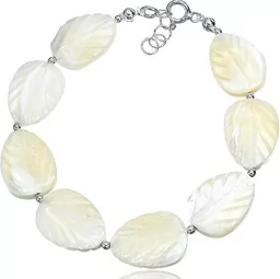 Bransoletka z naturalnej masy perłowej rzeźbionej ręcznie w kształcie delikatnych listków. Piękna biżuteria o naturalnej urodzie. Wielkość masy perłowej: ok. 20 mm Długość: ok. 20 cm (możemy dopasować) Srebrne zapięcie, łączenia oraz łańcuszek regulujący wykonane ze srebra próby 925.