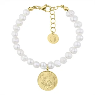Subtelna i efektowna bransoletka z pereł hodowanych z medalionem z okiem. Wykończona antyalergiczną stalą szlachetną 316L, pozłacaną metodą PVD. Biżuteria z perłami uzupełni stylizacje codzienne, jak i te na ważne okazje, dodając lookowi niepotwarzalnego charakteru. AMULET OCHRONNY