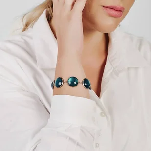 Ta bransoletka to element biżuterii z kolekcji “W blasku perłowego księżyca”. Jej ręcznie malowane kaboszony ze szkła zachwycają subtelnym, opalizującym blaskiem, niczym odbicie księżyca na tafli wody. Bransol ...