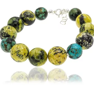 Długość - ok. 21 cm Wielkość kamieni - turkus żółty 14 mm, turkus afrykański 12 mm Zapięcie i łączenia wykonane ze srebra 925. Próba na zapięciu.
