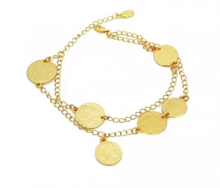 Podwójna bransoletka z monetkami. Stal szlachetna pozłacana. Gwarancja pozłocenia i jakości. Warstwa złota naniesiona w metodzie - PVD- napylanie próżniowe jonami tytanu, czy też azotkiem tytanu jest nowoczesną metodą nanoszenia powłok o bardzo dużej trwałości. * Pokryte jest w całości 4 - 8 mikronową warstwą 14K, 18K i 24K złota.