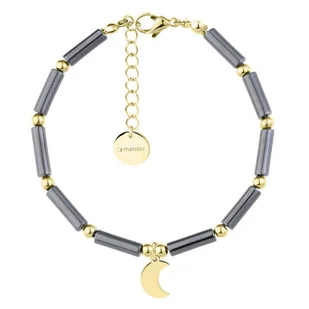 Bransoletka z drobnego hematytu w kolorze grafitowym ze złotymi kuleczkami. Bransoletka wykonana z hipoalergicznej stali szlachetnej, pozłacanej trwałą metodą PVD. Bransoletka prezentuje się niezwykle efektownie i doda pazura każdej stylizacji. Ozdobiona charmsem księżycem, który doskonale nadaje się na umieszczenie subtelnego grawerunku. Materiał: stal szlachetna, kamień