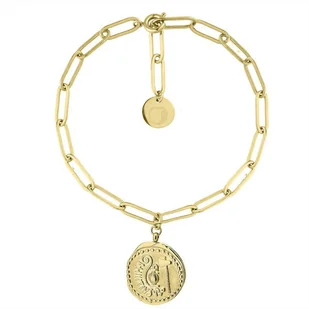 Bransoletka damska - łańcuch o modnych, płaskich, prostokątnych ogniwach. Z medalionem stylizowanym na antyczną monetę. Możliwość zapięcia bransoletki w dowolnym miejscu. Wykonana z hipoalergicznej stali szlachetnej, pozłacanej trwałą metodą PVD. Pasuje do każdej stylizacji, zarówno tej do biura, jak i na elegancką kolację.