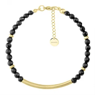 Bransoletka wykonana z fasetowanych, czarnych onyksów, wykończona pozłacanymi przekładkami i rurką na środku. Znakomity dodatek do codziennego ubioru dla kobiet lubiących oryginalną biżuterię. Noś ją samą lub stwórz własną kompozycję z innymi bransoletkami. AMULET OCHRONNY