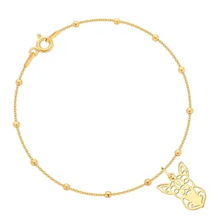 Bransoletka ze srebra próby 925 pozłacanego 24-karatowym złotem.Bransoletka została wykonana z łańcuszka oraz zawieszki w kształcie pieska chihuahua.Długość bransoletki: uniwersalna 18 cmWielkość zawieszki: ...