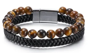 - Elegancka, stylowa bransoletka ze skórzanym, gładkim paskiem oraz plecionką, a także dodatkiem wyjątkowych kamieni tygrysiego oka, które są niezwykle oryginalne i stylowe, nadające ponadprzeciętnego charakteru bransolecie.