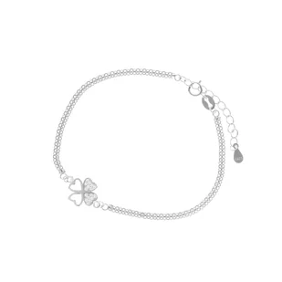 Delikatna srebrna bransoletka wykonana z najwyższej jakości srebra próby 925 z motywem czterolistnej koniczynki, której listki mają kształt serca i dwa ozdob...
