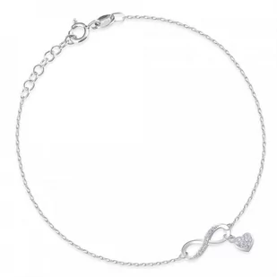 Bransoletka srebrna nieskończoność Bransoletka została wykonana z wysokiej jakości srebra próby 925 . Bazą kompozycji jest łańcuszek o klasycznym, geometrycznym splocie typu Anker . Długość bransoletki można regulować w przedziale od 17 do 20 cm za pomocą ogniw umieszczonych na końcu bransoletki. Zwieńczeniem kompozycji jest efektowna aplikacja w formie znaku nieskończoności oraz serduszka. Długość bransoletki: