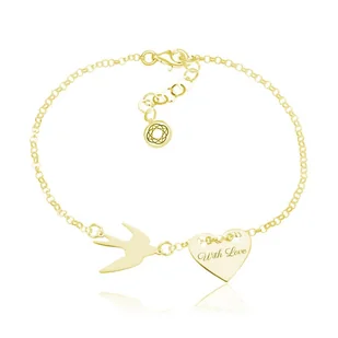 Srebrna bransoletka Hailey wykonana ze srebra pr. 925 pokryta 24k złotem. wymiary serduszka - ok. 1,2 x 1,5 cm wymiary jaskółki - ok. 1,2 x 1,5 cm długość - ok.