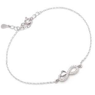 Srebrna bransoletka na rękę, damska z zawieszką z z symbolem nieskończoności z serduszkiem z cyrkoniami. Ręcznie wykonana z lśniącego srebra próby 925. Brans...