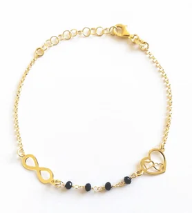 Srebrna bransoletka pozłacana z czarnymi kamyczkami, serduszko, znak nieskończoności Bardzo efektowna, pozłacana bransoletka z czarnymi kamyczkami, serduszko...