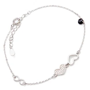 Srebrna bransoletka na rękę, damska z zawieszką w kształcie dwóch serc z cyrkoniami oraz symbolem nieskończoności. Ręcznie wykonana z lśniącego srebra próby ...