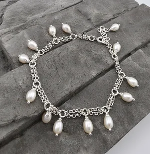 Elegancka, kobieca i wyjątkowa bransoletka na kazdą okazję, także na ślub. Wykonana w całości ze srebra próby 925 oraz bialych, naturalnych pereł slodkowodnych wielkości ok. 6-7 mm. Całkowita długość bransoletki r ...