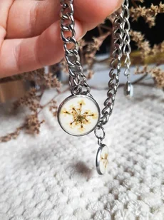 Srebrna bransoletka składająca się z grubszego łańcuszka oraz dwóch zawieszek - charmsów z zatopionymi suszonymi kwiatami. Prowadzimy małą pracownię zajmującą się tworzeniem czegoś z niczego :) Wszystkie nas ...
