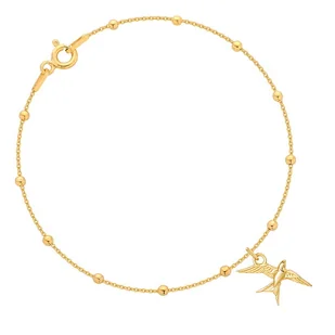 Subtelna, elegancka bransoletka ze srebra próby 925 pozłacanego 24-karatowym złotem.Bransoletka została wykonana z łańcuszka z ozdobnymi kuleczkami i zawieszki w kształcie jaskółki.Metal szlachetny: srebro pozłac ...