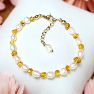 Wielkość kamieni - Bursztyn 4-5mm, Perły 5-7mm, przekładki 3mm Zapięcie - zapięcie typu karabińczyk z przedłużką. Kamienie użyte w bransoletce: Bursztyn bałtycki - Ta bransoletka skrywa w sobie kawałek słońca. Bursztyn to Twój osobisty filtr przeciw złym nastrojom i cudze zazdrosne spojrzenia. Daje energię, dodaje pewności siebie i sprawia, że czujesz się tak, jakbyś nosiła złoty promień na nadgarstku.