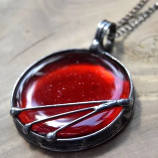 Wisior o średnicy 5 cm wykonany z czerwonego szkła lutowany stopem cyny i srebra zawieszony na 60 cm łańcuszku. Jeśli życzą sobie Państwo inną dowolną długość łańcuszka proszę o informacje mailową po zakupie a bez problemu to zmienię. Zapraszam do zakupu . . .
