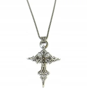 MASYWNY, GOTYCKI NASZYJNIK Z KRZYŻEM STAN: NOWY KOLOR: SREBRNY DŁUGOŚĆ ŁAŃCUCHA: 60 CM WYMIARY ZAWIESZKI: 7,6x5,4 CM MATERIAŁ: METAL WAGA: 31 g
