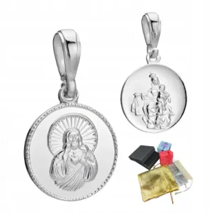 Srebrny medalik szkaplerzny – Najświętsze Serce Jezusa i Matka Boża z Góry Karmel (srebro próby 925)Piękny, srebrny medalik szkaplerzny wykonany z wysokiej jakości srebra próby 925 to wyjątkowy symbolnbsp;wiarynbsp;inbsp;duchowej opieki.Z jednej strony przedstawia wizeruneknbsp;Najświętszego Serca Pana Jezusa, pełen miłości i miłosierdzia, a z drugiej –nbsp;Matkę Bożą z Góry Karmel, która otacza swoje dzieci szczególną troską i błogosławieństwem.Ten klasyczny wzór ma głębokie znaczenie religijne – szkaplerz to znak przynależności do Maryi, symbol oddania i ufności.Noszony na szyi, przypomina o Bożej obecności w codziennym życiu oraz o duchowej więzi z Chrystusem i Jego Matką.Parametry: