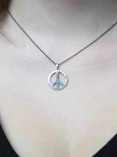 Zawieszka wykonana ze srebra próby 925 przedstawiająca pacyfkę - symbol pokoju i pacyfizmu. Twórcą tego znaku jest brytyjski projektant Gerald Holtom, który wykorzystał alfabet semaforowy, używany dawniej przez