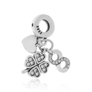 Srebrna zawieszka/charms do bransoletki koniczynka i znak nieskończoności pr. 925 Precyzyjnie wykonana srebrna zawieszka charms próby 925. Kamień: Cyrkonie białe Motyw: Koniczyna, znak nieskończoności Materiał: Srebro Próba: