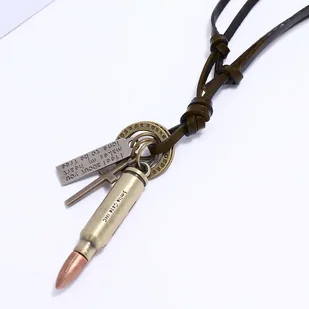 Wisior w kształcie naboju zawieszony na brązowym sznurku. Obwód regulowany: 40 cm - 71 cm. Długość naboju: 5,5 cm.