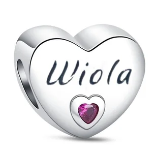 Zawieszka do bransoletki modułowej (srebro 925) Charms "Serce z imieniem Wiola" to srebrna zawieszka w kształcie serduszka, ozdobiona różowym kamieniem w opr...