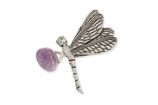 Broszka wazka z ametystem Piękna broszka przedstawiająca ważkę niosącą ametyst. Powierzchnia retro, koloru patynowanego srebra. Zapięcie na długą i mocną agrafkę. Symbol zwinności i aktywności oraz odnowy. ✔ Produkt jest dostępny ✔ Polska marka ✔ Fabryczne opakowanie Informacje Marka:
