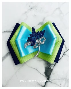 . Broszka wykonana z wysokiej jakości taśm i dodatków. Brosza w kolorze granatu, soczystej zieleni i błękitu. Na środku naszyta śliczna ozdoba biżuteryjna, bukiet kwiatów wykonany z kryształków. Będzie ide ...