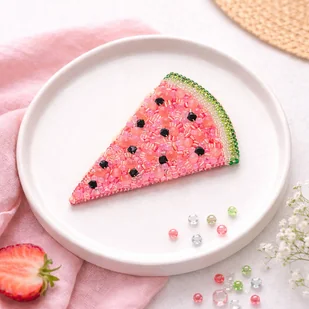 Soczysta, letnia i pełna koloru ręcznie wykonana broszka w kształcie plasterka arbuza, stworzona techniką haftu koralikowego. Każdy element został starannie doszyty, dzięki czemu broszka pięknie mieni s ...