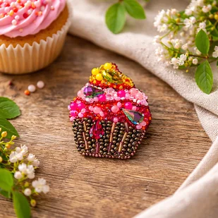 Urocza broszka w kształcie babeczki, wykonana ręcznie techniką haftu koralikowego. Pełna koloru, blasku i drobnych detali – wygląda jak małe, słodkie dzieło sztuki. Każdy koralik został starannie przyszyty, ...